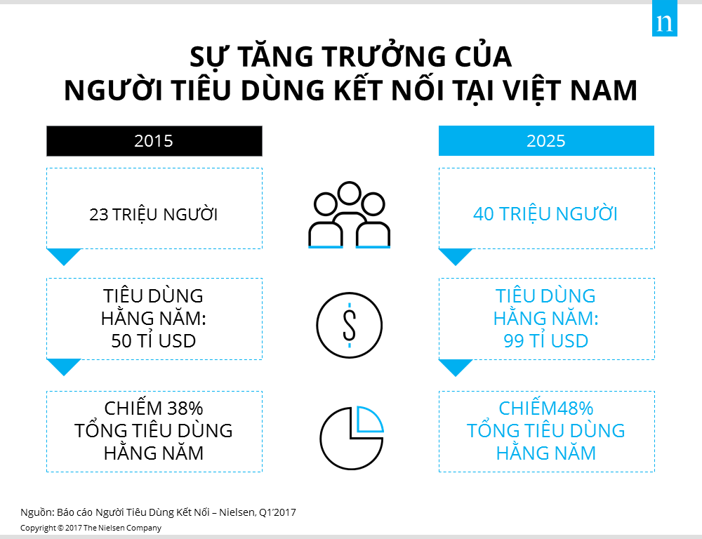 In Vietnam lag die Anzahl der vernetzten Verbraucher im Jahr 2015 bei 23 Millionen, und es wird prognostiziert, dass diese Zahl bis 2025 nahezu verdoppelt wird und 40 Millionen erreichen wird. Darüber hinaus zeigt die Forschung, dass die jährlichen Ausgaben vernetzter Verbraucher in Vietnam von 50 Mrd. USD im Jahr 2015 auf 99 Mrd. USD im Jahr 2025 steigen werden. Bis 2025 werden sie voraussichtlich etwa die Hälfte des gesamten Jahresverbrauchs ausmachen.