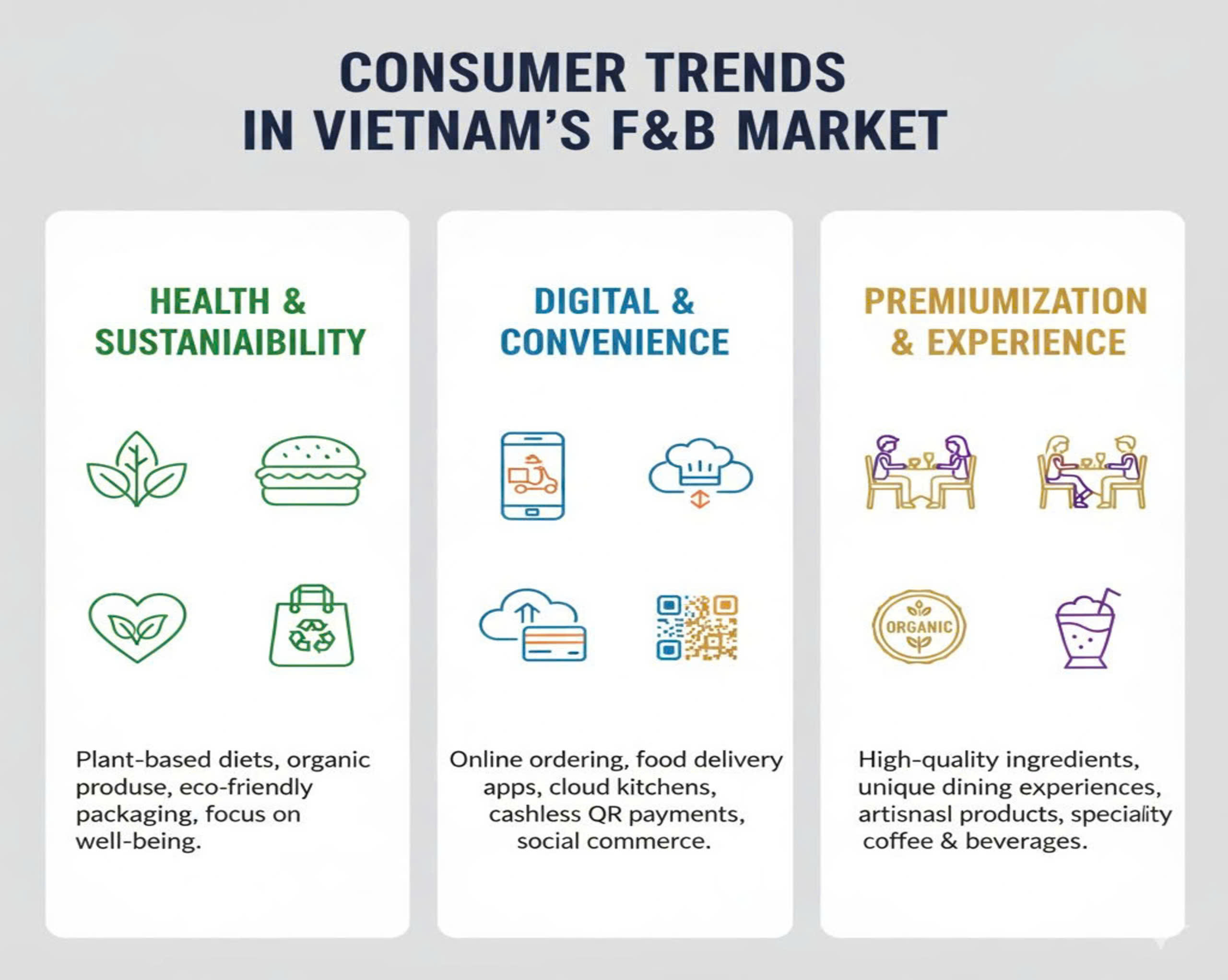 - Chi Tiêu: Giới trẻ (25–34 tuổi) chi khoảng 10% thu nhập cho F&B. Người tiêu dùng sẵn sàng chi thêm cho sản phẩm organic, đồ uống thủ công và trải nghiệm ẩm thực độc đáo