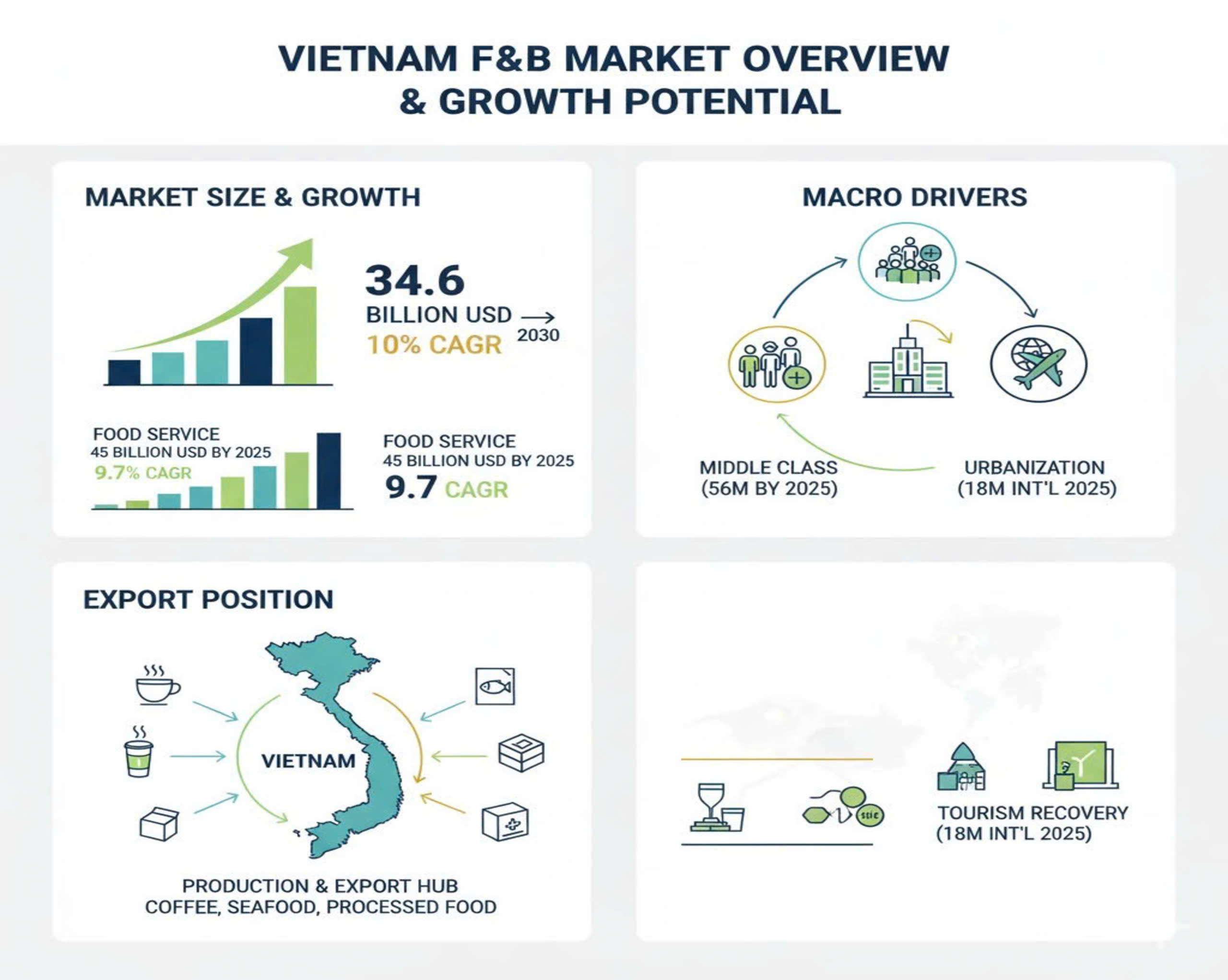 Thị trường F&B Việt Nam đang bước vào giai đoạn tăng trưởng năng động và phức tạp. Tổng giá trị thị trường dự kiến đạt 34,6 tỷ USD vào năm 2030, với tốc độ tăng trưởng kép (CAGR) toàn ngành khoảng 10%.