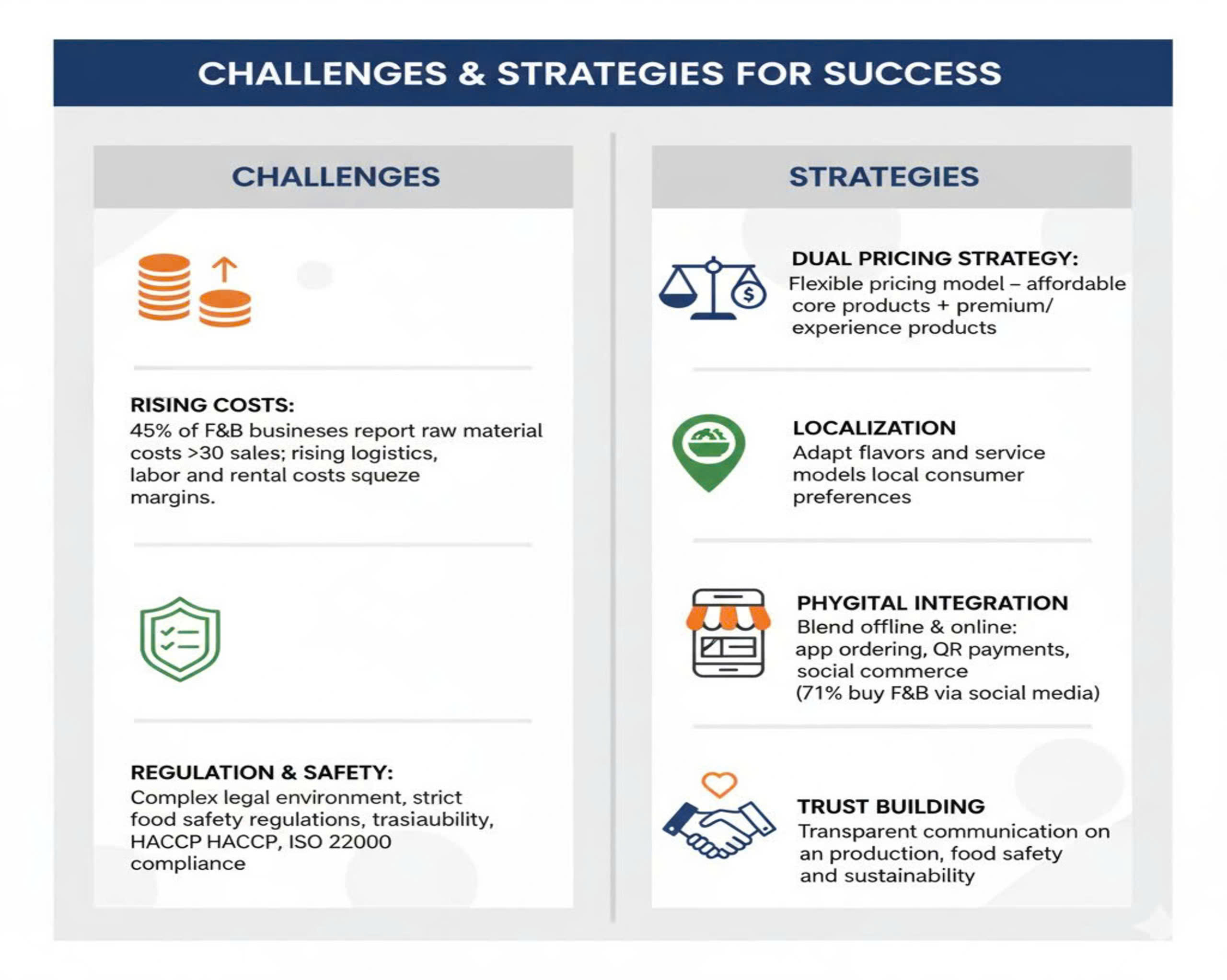 - Pháp lý và An toàn: Môi trường pháp lý phức tạp, đặc biệt là các quy định mới về an toàn thực phẩm, đòi hỏi sự minh bạch về truy xuất nguồn gốc và tuân thủ các chứng nhận quốc tế (HACCP, ISO 22000).